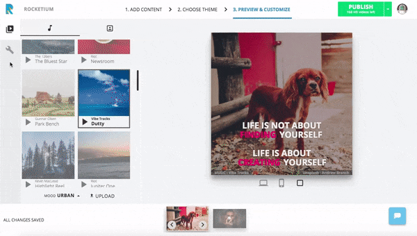 Con Rocketium puoi fare splendidi video online con bellissime immagini senza copyright e creare i tuoi temi personali utilizzando i video creati da altri. clona i video per avere contenuti, transizioni simili o fare A/B test.
